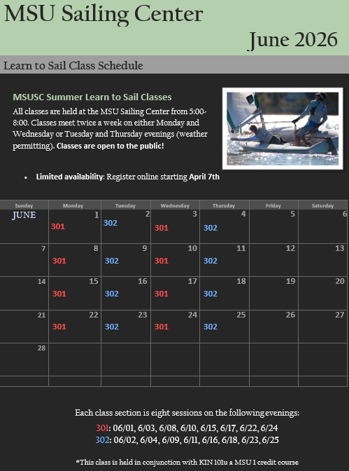 Summer 2026 Learn to Sail Class Schedule: (See calendar below)